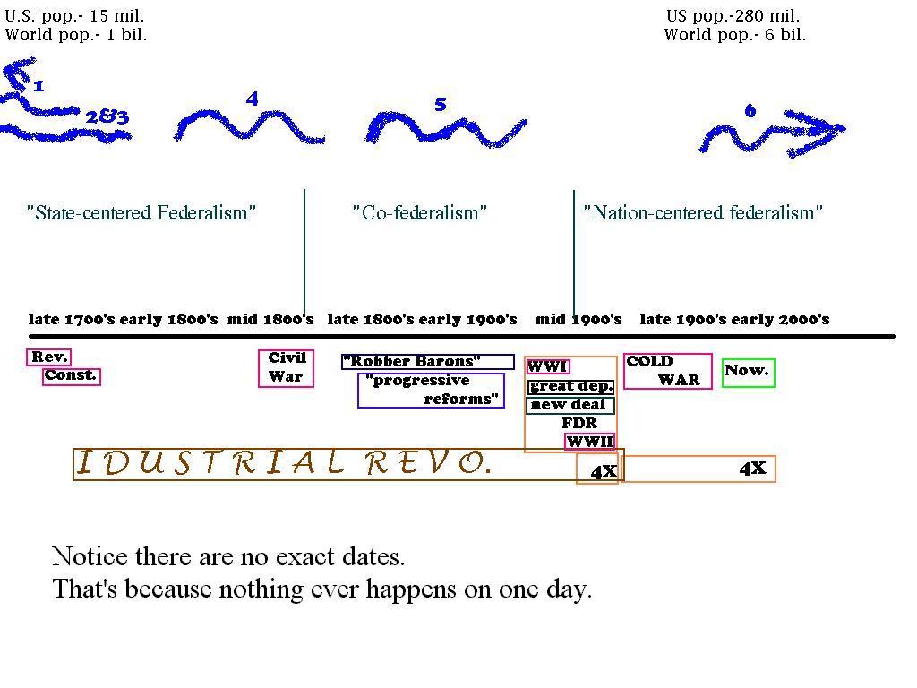 Have you ever been in a relationship? Of course you have, not just love but family, etc - those are all human relationships. I bet you are an expert in human relationships! So as an expert in human relationships, let me ask you do relationships (a) never change, or (b) always change over time? It's b., right? So it is with Federalism. Federalism is nothing more than the relationship between the federal, central or national government and the governments of all the states. Each state is slightly different and so each state government is slightly different in the way in which they do politics, run elections, parties, etc.. Like all relationships, US federalism has changed over time... Remember the time line I drew up for you: